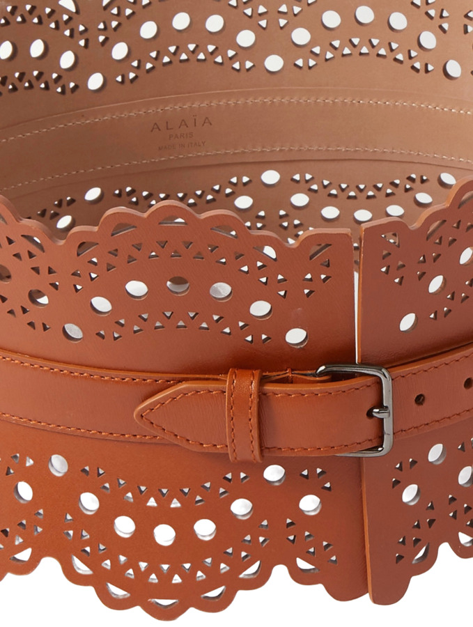 Alaïa's waist belt, crafted in Italy from supple 'Cognac'-hued leather, features the house's signature laser cutouts. This versatile accessory can be styled cinched over an oversized shirt or a figure-skimming dress, adding a refined touch to any outfit.