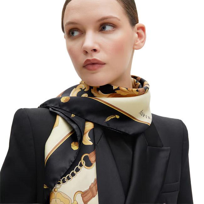 Indulge in luxury with our handcrafted 100% pure Italian silk twill scarf. Adorned with our instantly recognizable signature shield design, this print is sure to make a statement. The fabric is soft and feather-light, providing the ultimate in comfort, while finely rolled hand-stitched edges add an exquisite finishing touch. Experience the epitome of elegance with this timeless accessory.