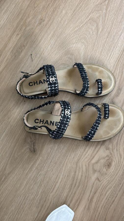 Introducing the Chanel 'CC' Tweed Sandals from the Resort 2021 Collection. These two-tone tweed flat sandals feature a central 'CC' charm adorned with a fancy pearl. With a smooth suede insole showcasing the 'Chanel' signature and an adjustable buckle closure at the ankle, they are the perfect summer sandals, embodying the elegance of the House of Chanel.