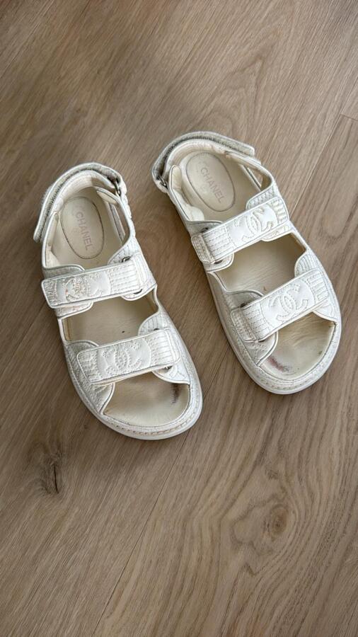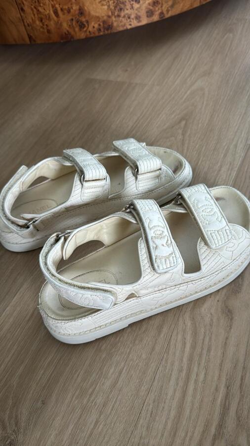You'll fall in love with these stylish and modern Chanel sandals. Crafted from leather, they feature the brand's signature quilt, velcro straps, and iconic CC logos on the uppers. Perfect for achieving a chic casual look, these sandals combine comfort and elegance effortlessly.