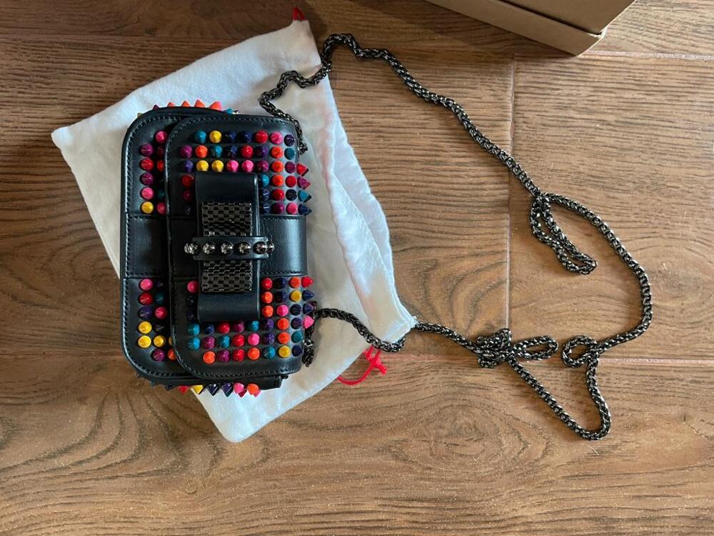 This modern Sweet Charity bag is embellished with multi colored spike to give any outfit an edge.