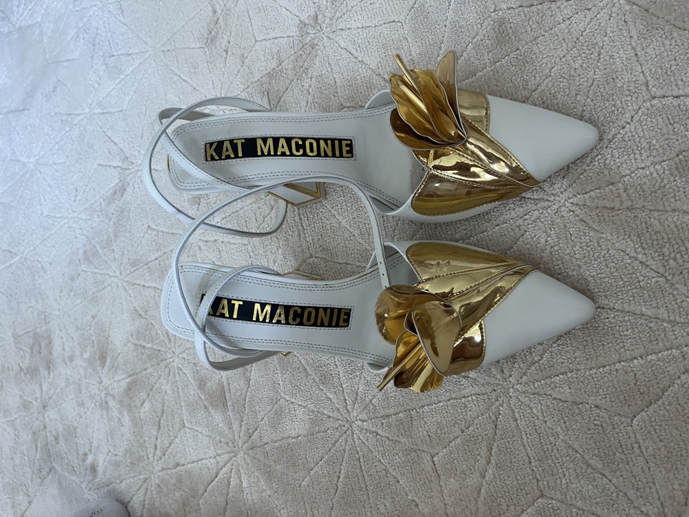 Ready for holiday festivities, the Rafi heel is a showstopper with 3D petals in white and gold leather at the toe. Its pointed toe and high, hourglass heel are poised to make a statement and have everyone talking about your parties.