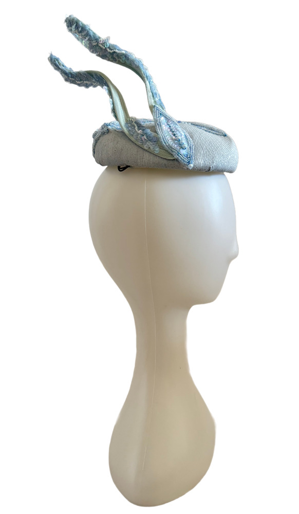 A stunning blue pillbox headpiece adorned with intricate beaded motif leaves, adding a touch of glamour and sophistication to your ensemble. Perfect for the races or a gorgeous wedding.