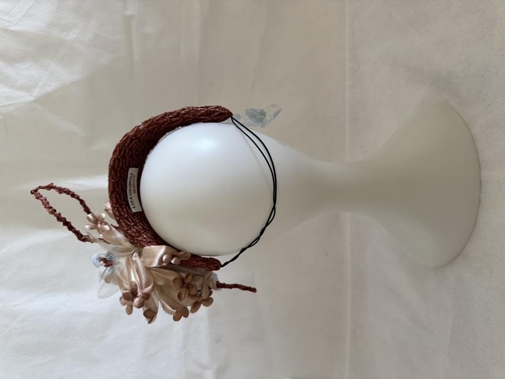 An exquisite blue vintage veiling on straw bandeau headpiece, featuring a vintage floral wired trim. Perfect for weddings and horse races, exuding timeless elegance and charm.