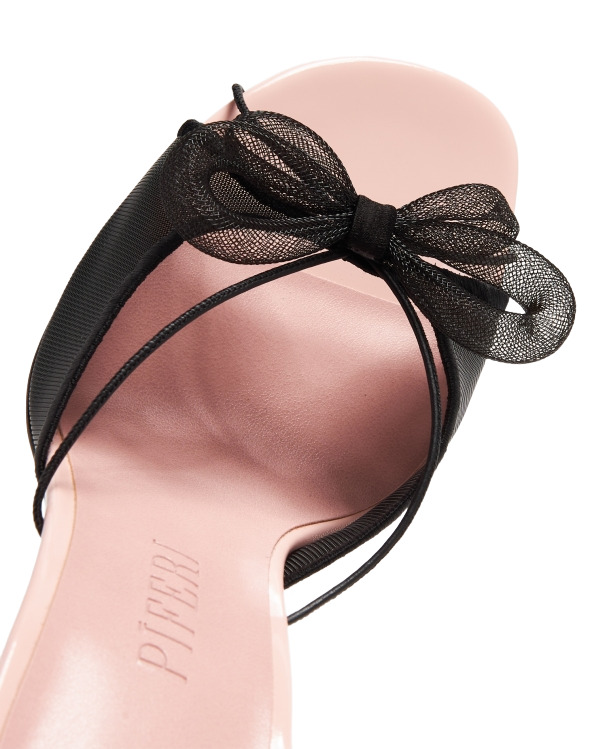 The Pīferi Whisper 105mm mesh wrap-around sandals, made in Italy, are a stunning combination of elegance and edge. Featuring a sleek black design with intricate mesh panelling, charming bow detailing, and open toes, these sandals also boast lace-up accents and a branded insole. The 105mm angled comma heel adds a bold finish, making them a must-have for any stylish wardrobe.