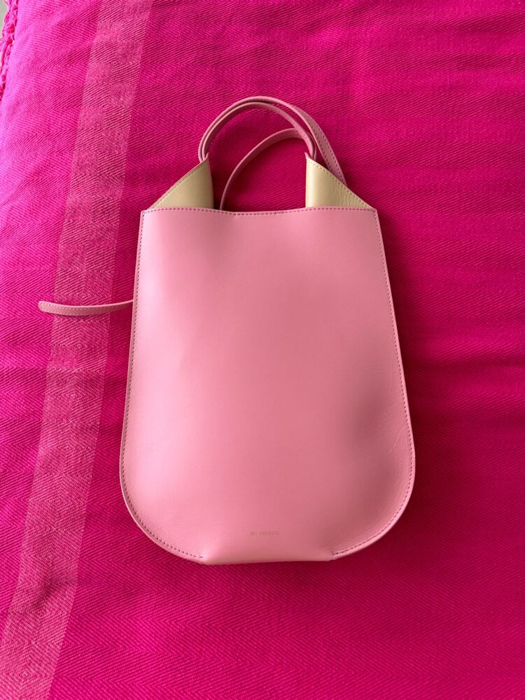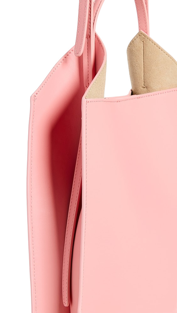 This structured tote bag is crafted from premium calfskin leather. Its silhouette features clean lines and a defined shape, with a magnetic snap closure at the top. Inside, there is a convenient patch pocket. The interior is lined with suede for a soft, luxurious feel. Weighing in at 14oz/0.4kg, this well-made tote offers a lightweight yet durable design.