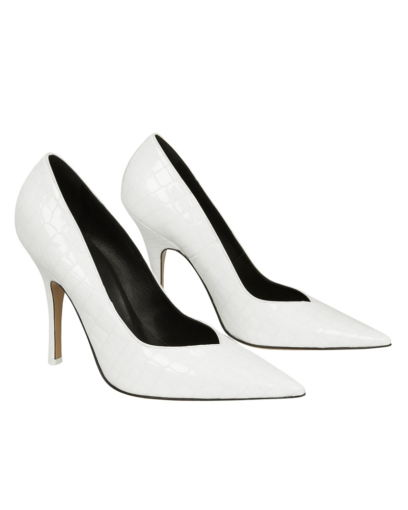 Patent white crocodile embossed pumps with an 80's deep v toe crease, shoes that dreams are made of.