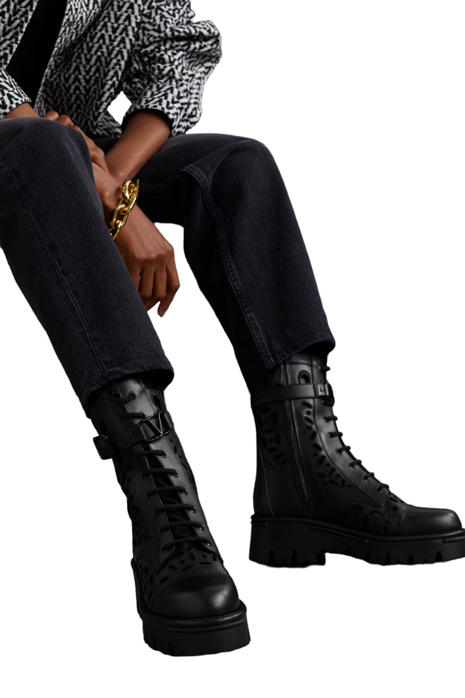 Get ready to rock the fashion battlefield with these seriously stylish Valentino Garavani boots! Combining elegance and functionality, these boots feature intricate floral laser-cut detailing that adds a touch of whimsy to their combat silhouette. And let's not forget the chunky rubber sole that's ready to conquer any terrain. These boots are the perfect fusion of fierce and fabulous, ensuring you step out in quirky style wherever you go!