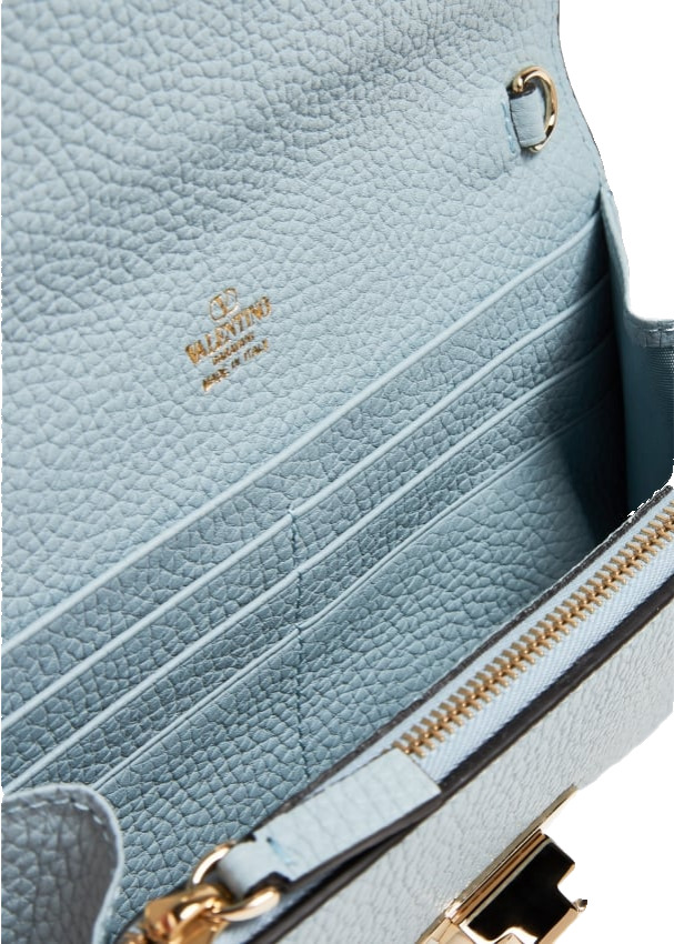 Valentino Garavani's Rockstud chain wallet offers versatility with its detachable chain. Crafted from grainy calfskin, it features platinum-finish studs and hardware, along with the line's signature hook-and-eye closure. This stylish wallet includes a fixed top handle, six card slots, one flat pocket, and one zip pocket, making it both functional and chic.