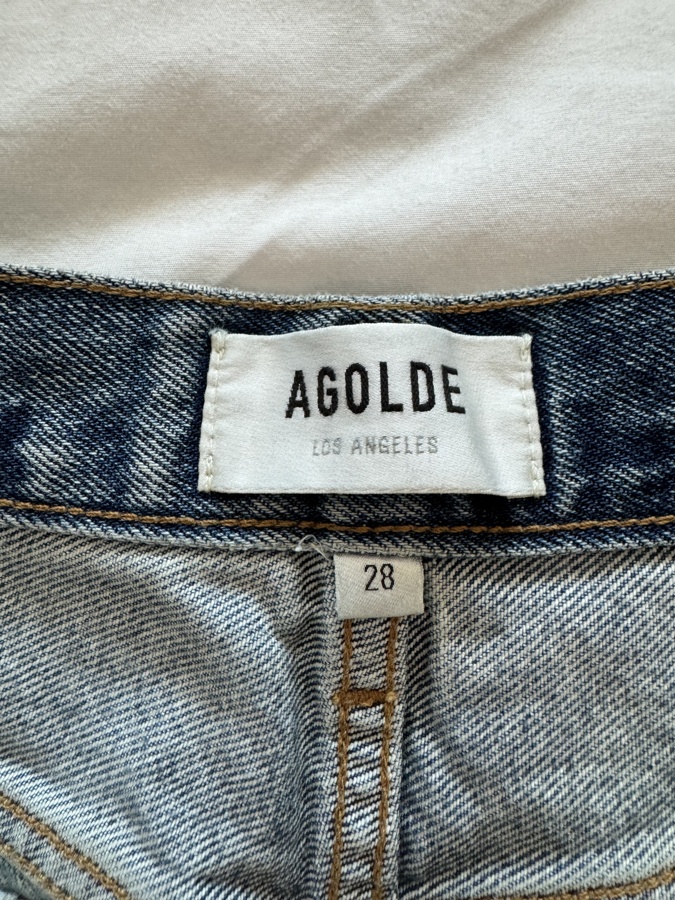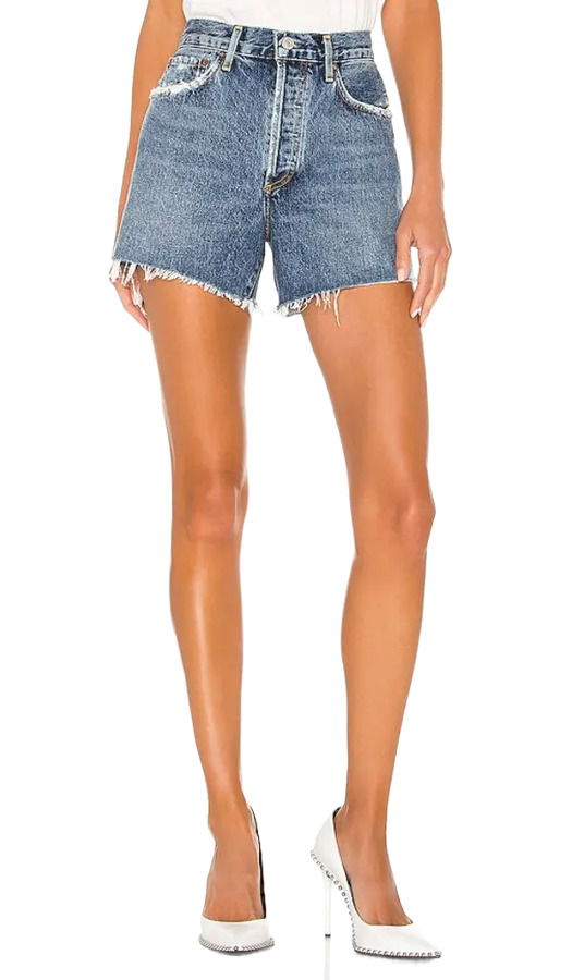 The AGOLDE Parker Long Vintage Loose Shorts are crafted from 100% organic cotton, featuring light fading and distressed details for a vintage look. These shorts have a button fly and a classic 5-pocket design, with a stylish frayed hem. Measuring approximately 13 inches in length, they are perfect for warm-weather outings while combining sustainability and style.