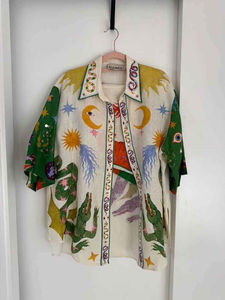 This oversized shirt combines masculine tailoring with a whimsical placement print of mermaids and fish. It features a point collar, concealed placket with shell buttons, and dropped shoulders. The relaxed jogger-style silhouette has a high-waisted fit, elasticated waist with ties, and in-seam pockets. Crafted from 100% linen, it offers both comfort and style.