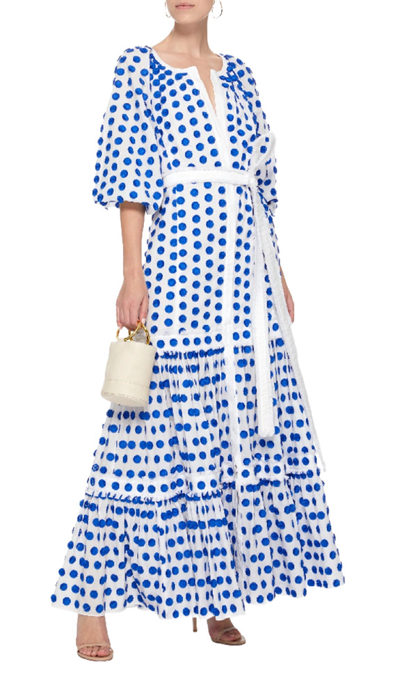 Indulge in the allure of the Alexis Gaiya Dot Embroidered Dress! With its captivating V neckline, button front placket, and sweeping maxi silhouette, it exudes timeless elegance.