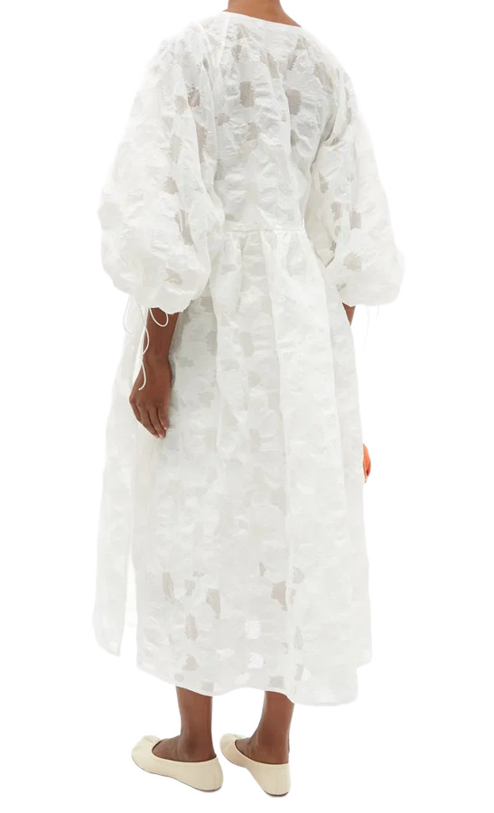 Cecilie Bahnsen captures an ethereal essence with the white Hella dress, expertly crafted from a cotton-blend fil coupé. It features a flattering V-neckline and charming puff sleeves, blending elegance with a whimsical touch. The fabric composition includes 39% cotton, 36% polyester, and 25% polyamide, while the lining is made from 100% silk, ensuring a luxurious feel.