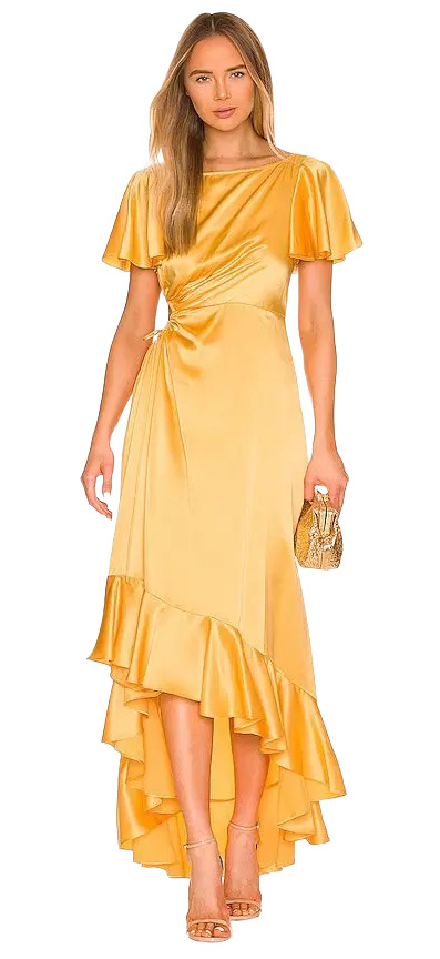 Introducing our playful midi-length wrap dress! With a luxurious satin silk finish, it's adorned with flounce sleeves and a charming ruffled hem, adding a touch of whimsy to your wardrobe.