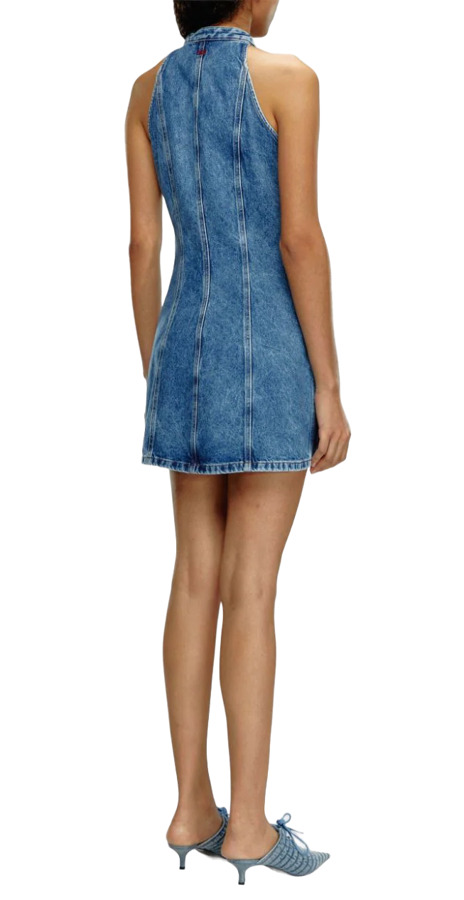 The Diesel De Lulu denim minidress is a stylish blue piece crafted from stretch-cotton denim. It features a halterneck design, sleeveless construction, and a press-stud fastening. The front two-way zip fastening adds practicality, while the straight hem finishes at thigh-length, making it a chic choice for warm-weather outings.
