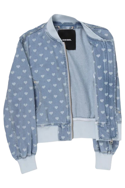 Diesel's denim delight! Zip up with branded flair. Stand tall with a ribbed stand-up collar, and let ribbing dance at the hem and sleeves. Pockets? Riveted perfection. Sprinkled with light-blue hearts, this jacket is your daily style anthem. Pair with kicks or slip-on sneakers—effortless cool awaits!