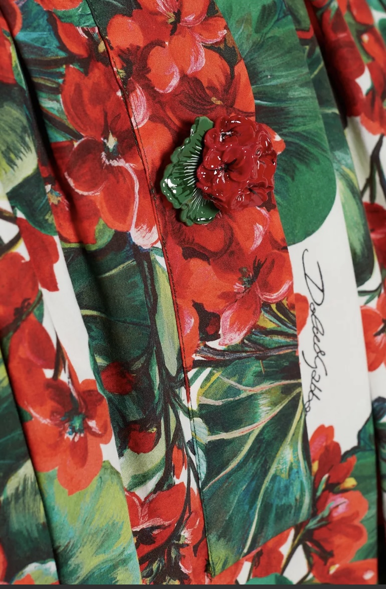 The FW19 Gerani Sundress from Dolce & Gabbana beautifully highlights the brand's passion for florals with its striking geranium print. Made in Italy from cotton poplin, it features a square neckline, a fitted waist, and a flared circle skirt, creating a timeless feminine silhouette. For an elegant look on sunny days, coordinate it with the matching handbag for a polished ensemble that exudes effortless charm.