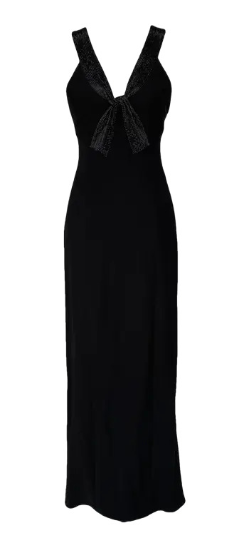 This elegant long dress from Emporio Armani features a stunning rhinestone bow, adding a touch of glamour to its sophisticated design. Crafted for a flattering fit, the dress flows gracefully, making it perfect for formal occasions. Its refined silhouette and eye-catching detail ensure you'll make a memorable impression.