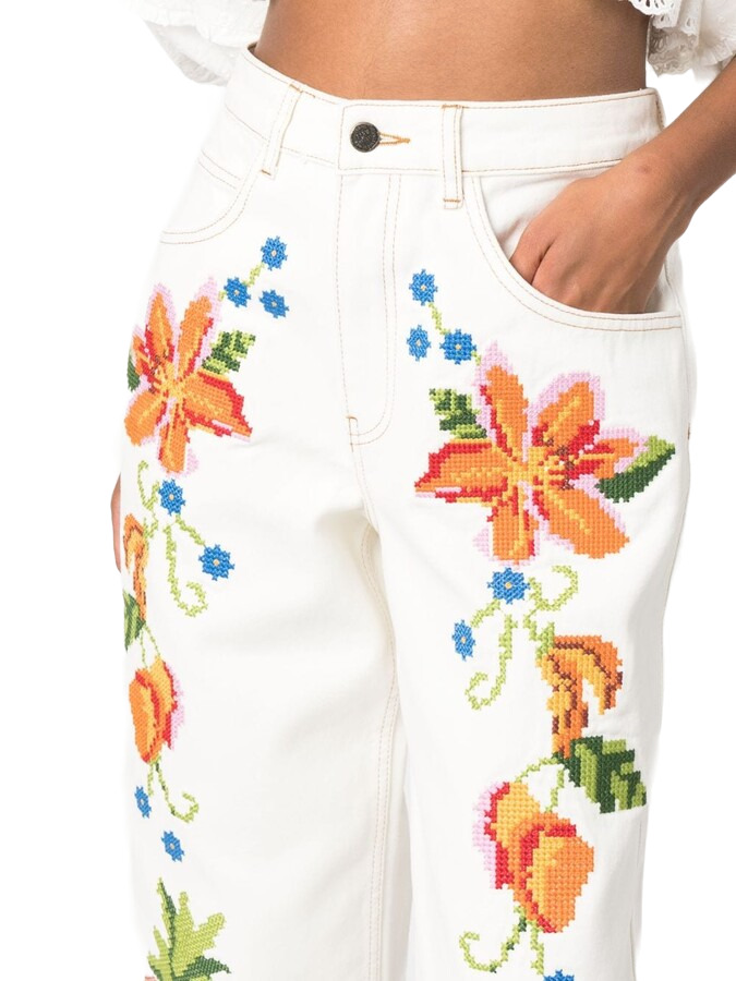 Introducing Farm Rio's Floral-Embroidered Wide-Leg Jeans! Bursting with vibrant blooms, these jeans add a playful twist to your denim collection. With their wide-leg cut, they offer comfort and style in one fabulous package. Perfect for making a bold statement wherever you go!