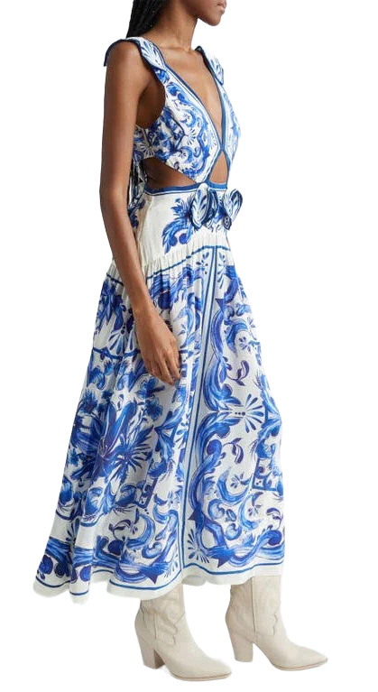 The FARM Rio Garden Tiles Cutout Maxi Dress features a plunging neckline, waist cutouts, and an open back. Ankle length with a hidden back-zip closure, this sleeveless dress is fully lined and crafted from 100% viscose. It has a 44-inch center length and is machine washable and tumble dry-friendly, making it both stylish and easy to care for.