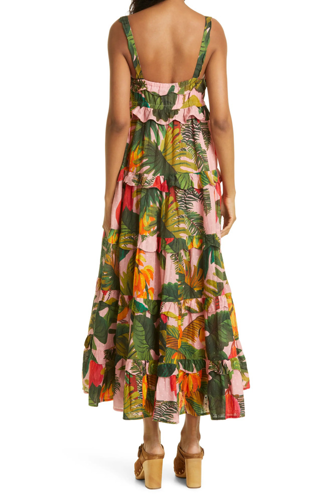 This flouncy maxi dress is the ultimate vacation essential! With a textured all-cotton print featuring tropical fronds and flowers, you'll be ready to soak up the sun in style. And those sweet scallops accenting each tier? They're the perfect touch of fun and flirty. Whether you're sipping cocktails by the pool or dancing the night away, this dress was made for making memories that will last a lifetime.