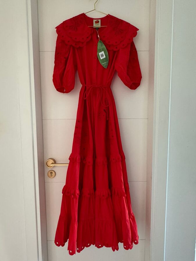 The Red Hummingbird Richelieu Maxi Dress by FARM Rio is a vibrant and stunning piece that captures the essence of Brazilian fashion. Featuring a round neckline, playful ruffle details, and intricate Richelieu embroidery, this dress exudes effortless charm and craftsmanship. The bold red hue and unique hummingbird pattern create a head-turning silhouette that is perfect for any occasion, making this maxi dress a must-have addition to any wardrobe.