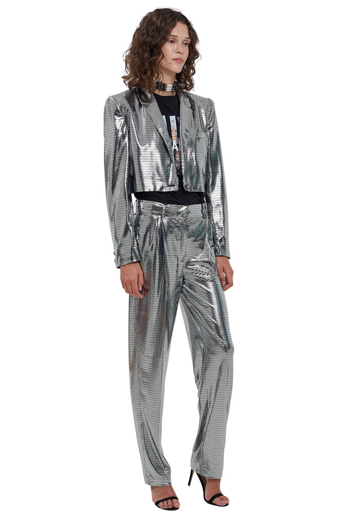 What's better than Silver slouchy tailored pants? Silver slouchy tailored pants and a matching oversized cropped silver jacket with shoulderpads of course! And lucky for you we have them both. Rent the set and take a leaf from the 'Gucci love parade' book by pairing with an edgy western boot and a pussy bow shirt.