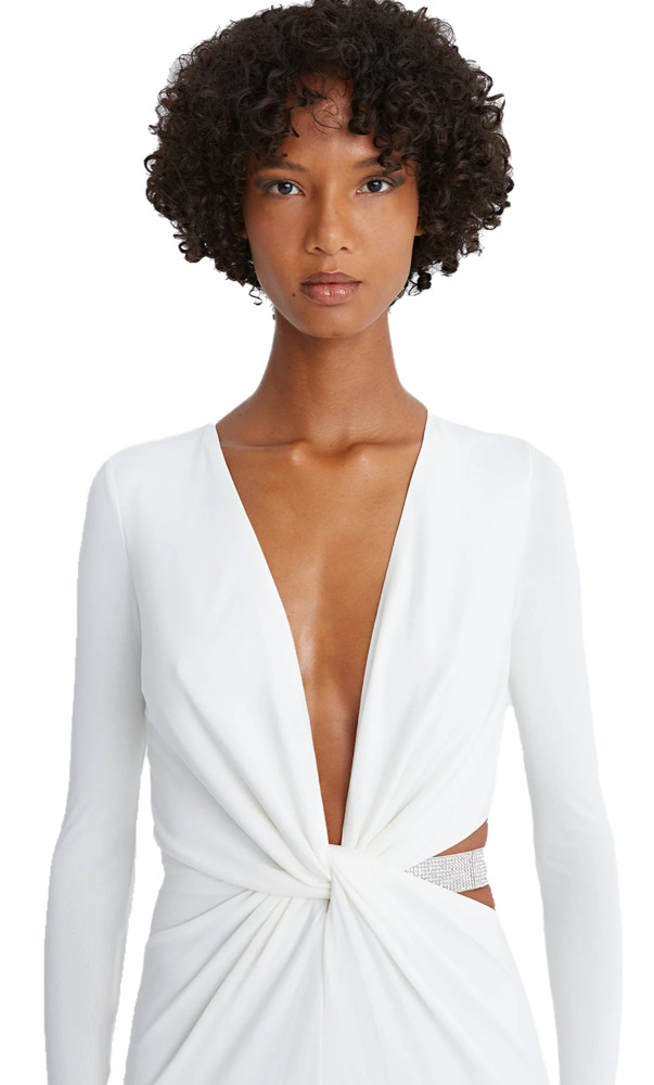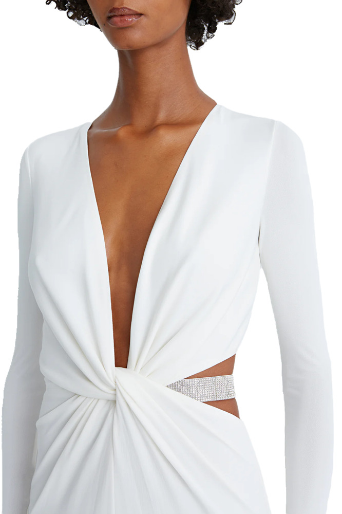 Elevate your evening in this Matte Jersey Twist Front Long Sleeve Gown featuring side cutouts and crystal embellishments. The gown boasts long sleeves, a plunging neckline, and a zipper closure for a sleek silhouette. Crafted from 70% rayon and 30% polyester, it is lined for added comfort and sophistication.