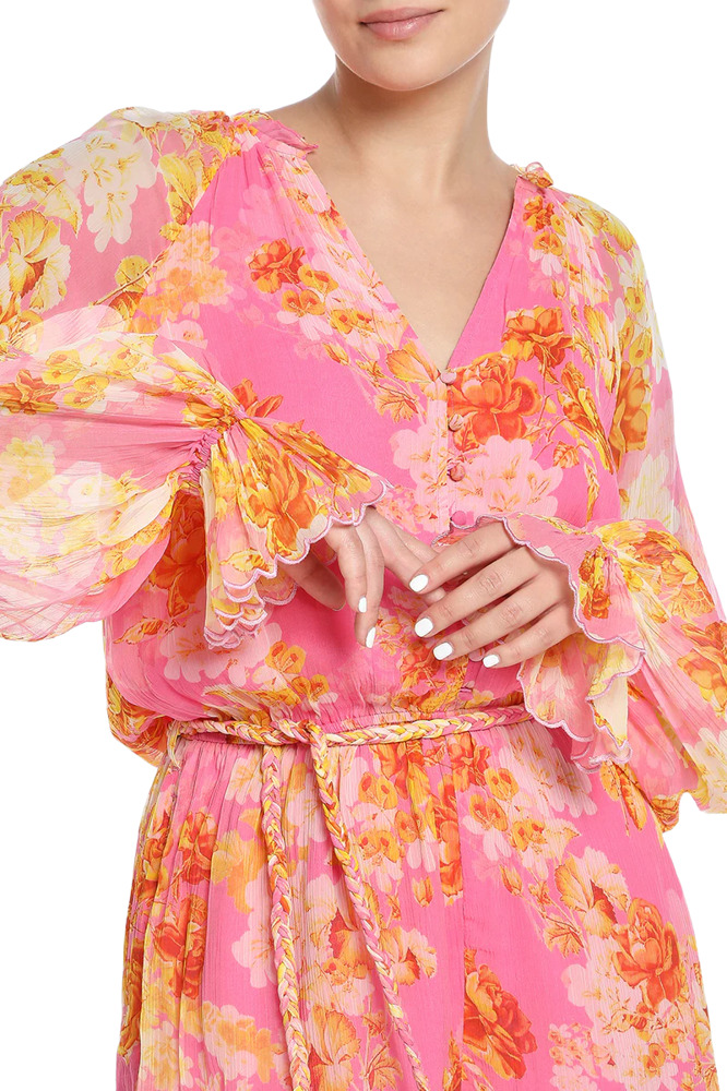 Get ready for summer picnics with the girls in style with Hemant & Nandita's Auril Romper. Crafted from lightweight viscose, it features charming balloon sleeves, an elasticated waistband with drawstrings, and an elegant lace trim hem, ensuring you look effortlessly chic and comfortable all day long.