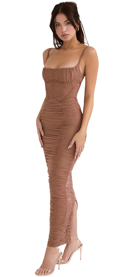 The 'Lilian' dress beautifully flatters your figure with its lustrous duchess satin bodice in mocha, featuring boning to cinch the waist and a gathered mesh overlay. Adjustable shoulder straps ensure a perfect fit, while the maxi-length skirt has a back split for easy movement.