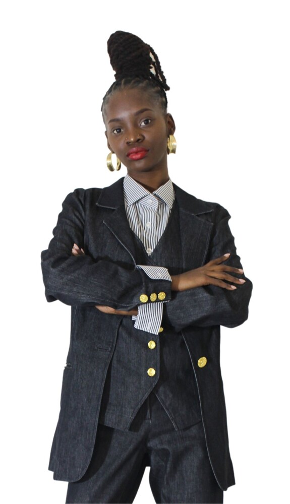 Introducing the Blake Suit: a three-piece ensemble in stretch black denim. The single-breasted blazer features pockets, paired with a coordinating waistcoat and cigarette trousers, all boasting convenient pockets for a sleek and functional look.