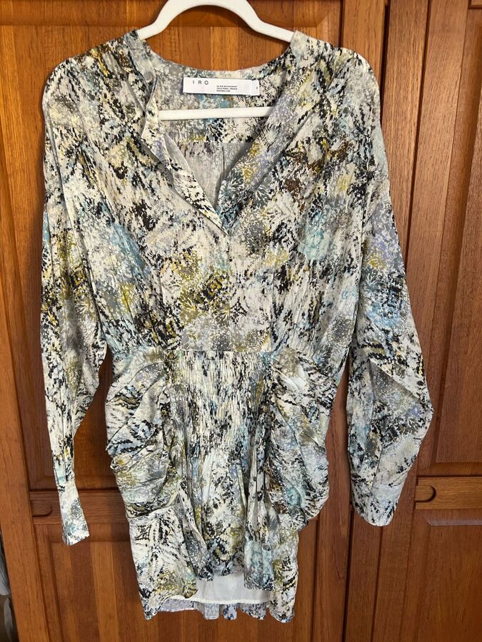 The IRO Deniz Ruched Printed Cotton Mini Dress is a captivating piece crafted from 100% cotton. It features stylish shirred trims and ruched detailing, along with buttoned cuffs for an added touch of elegance. The dress has a concealed button fastening at the front and is partially lined for comfort. Made from a non-stretchy, mid-weight fabric, it combines sophistication with a flattering silhouette, making it perfect for various occasions.