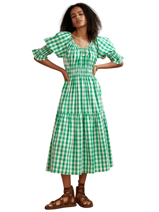 This dress is the ultimate ‘float around the garden’ style with an easy, flattering fit. It features puff sleeves, a voluminous tiered skirt. Wear it on or off the shoulders, and enjoy the comfort of the lightweight cotton that keeps you cool. Complete the look with chunky dad sandals and simple accessories for an effortless summer vibe.