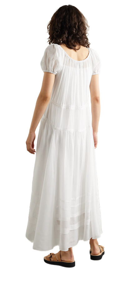 La Ligne's 'Isabelle' dress features a timeless design crafted from lightweight silk-chiffon. With fringed ties at each side for adjustable waist sizing, it offers a customizable fit. The removable slip ensures modesty by tempering the sheerness, making this dress perfect for both casual and elegant occasions. Its effortless style adds a touch of sophistication to any wardrobe.