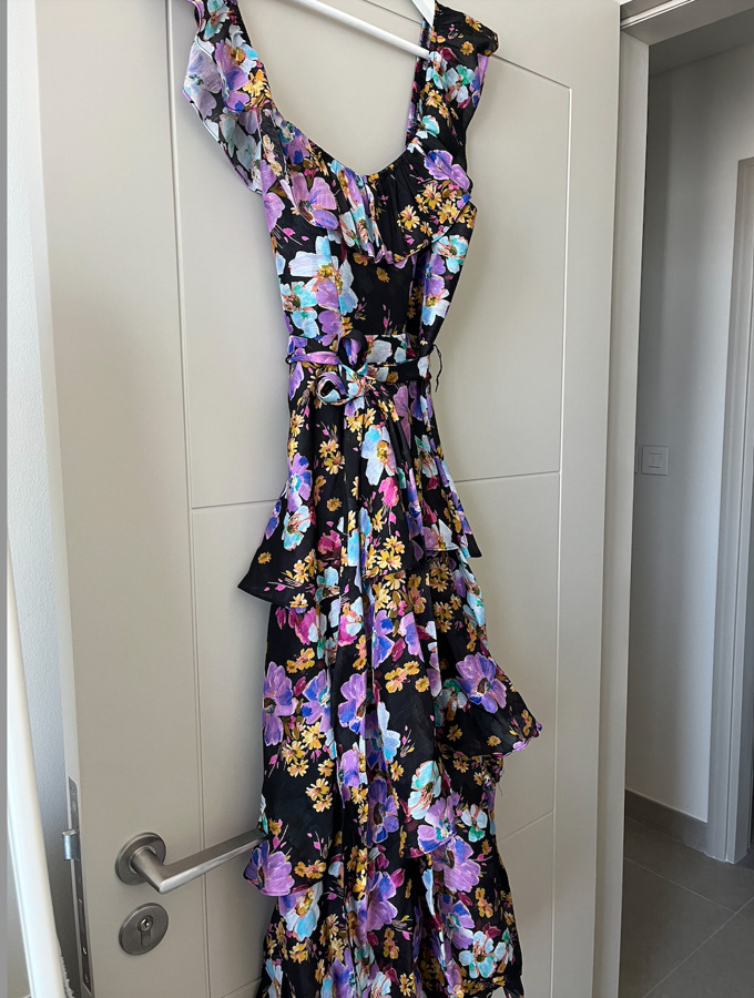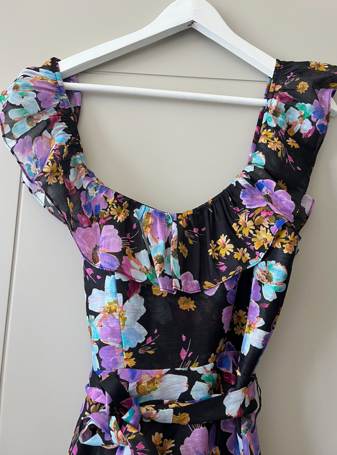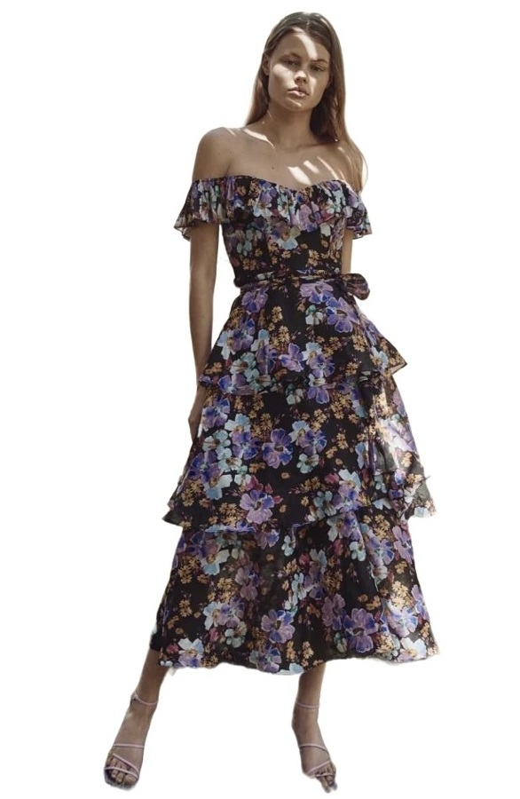 The Evolet Midi Dress from La Maison Talulah is a stunning creation in silk and linen, featuring an ethereal design with floaty detailing. It has a fitted waist with structured boning, a sweetheart neckline, and off-the-shoulder straps that can be worn up. The layered skirt flows gracefully, while an invisible center-back waist ensures a seamless fit for elegant occasions.