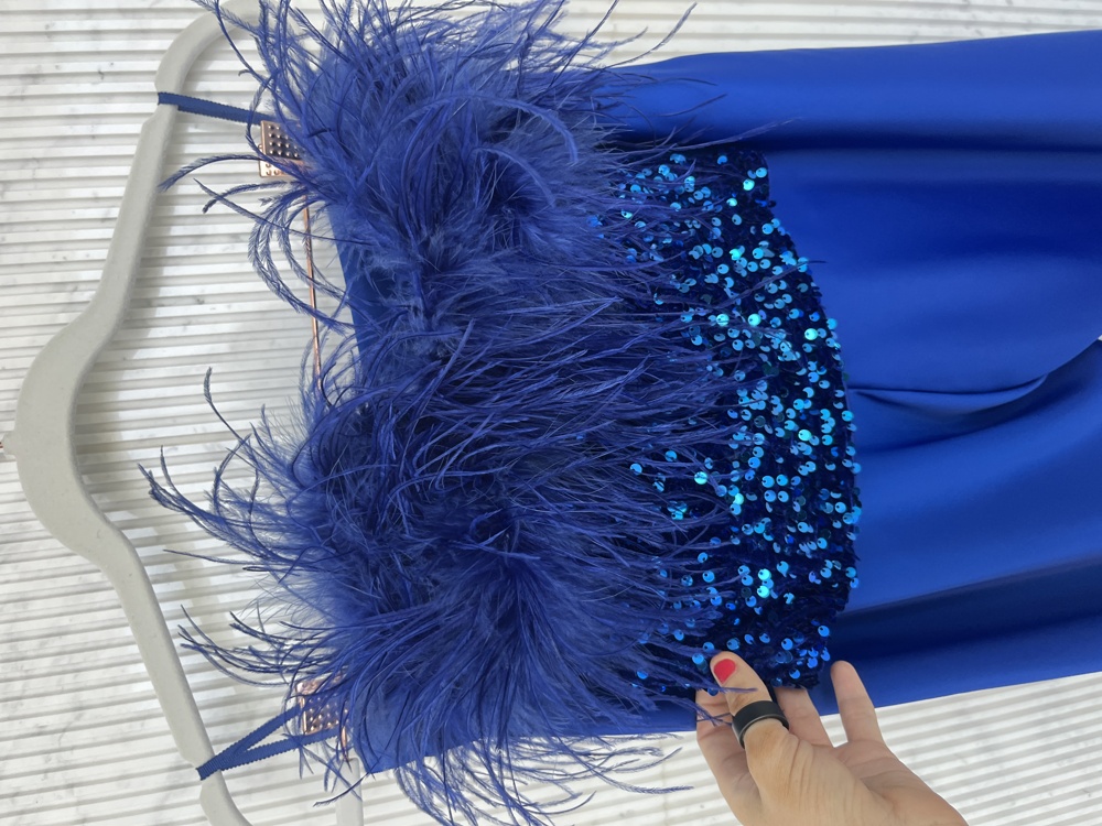 Line & Dot's Valerie Feather Top is a quirky twist on elegance! Featuring vibrant blue feathers and a bold exposed back zipper, this top combines whimsy with style.