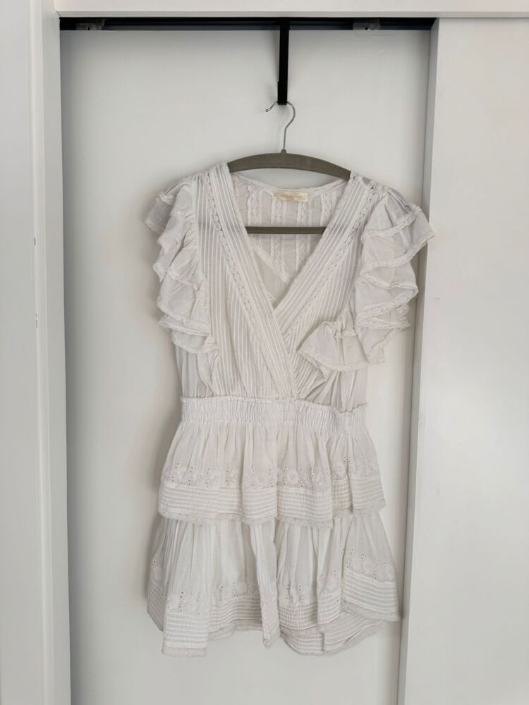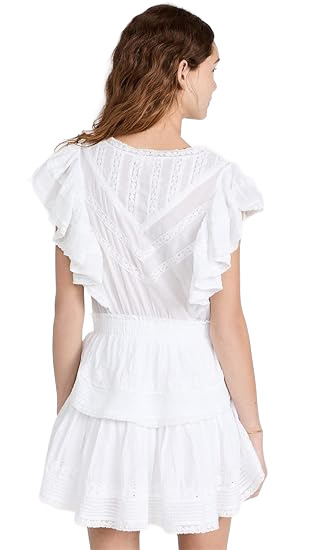The Gwen Dress is a cotton favorite featuring beautiful lace embroidery details. This short frock boasts a faux wrap top with a deep V neckline and shirred ruffles along the shoulders and bodice, creating flutter sleeves. The skirt mirrors the signature Ruffle Mini design, featuring an elastic waist and two flounced tiers for added movement.