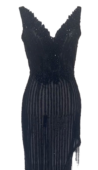 Exquisitely crafted, this Black Beaded Long Tulle Dress showcases intricate beadwork that dances across the sheer, voluminous tulle fabric. The long, elegant silhouette creates a striking, head-turning look, perfect for formal events and special occasions.