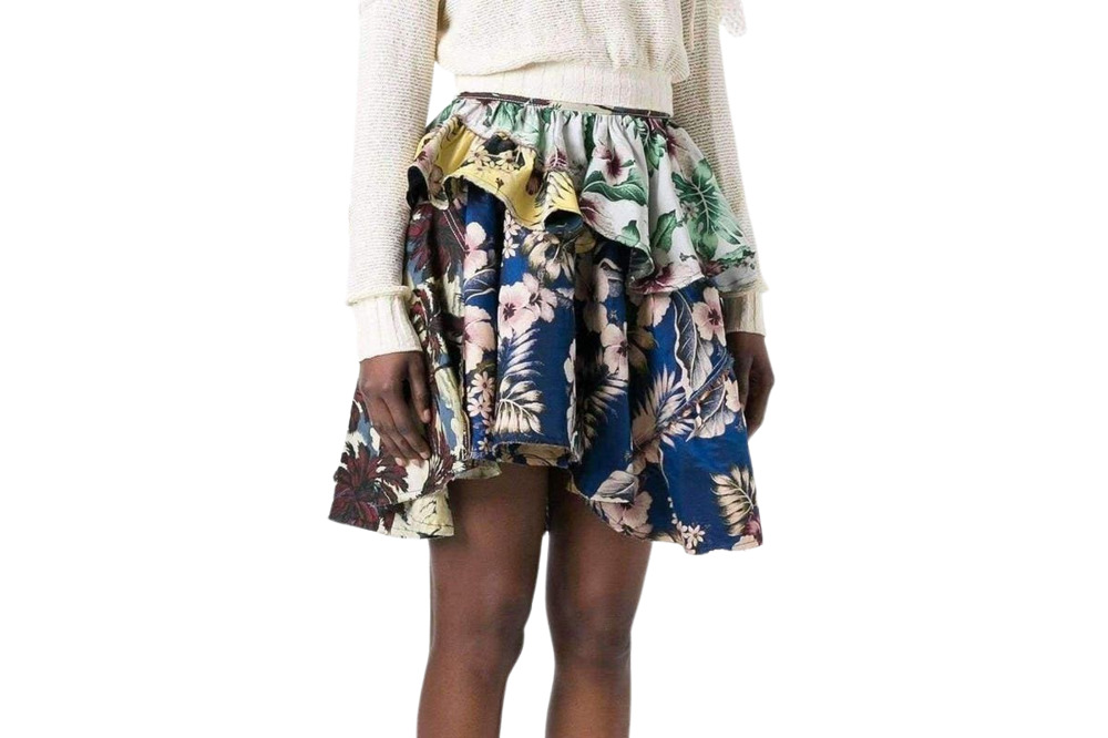 This floral print skirt is the perfect statement piece for Spring. Pulled in at the waist and flaring out with lovely layering and detail.