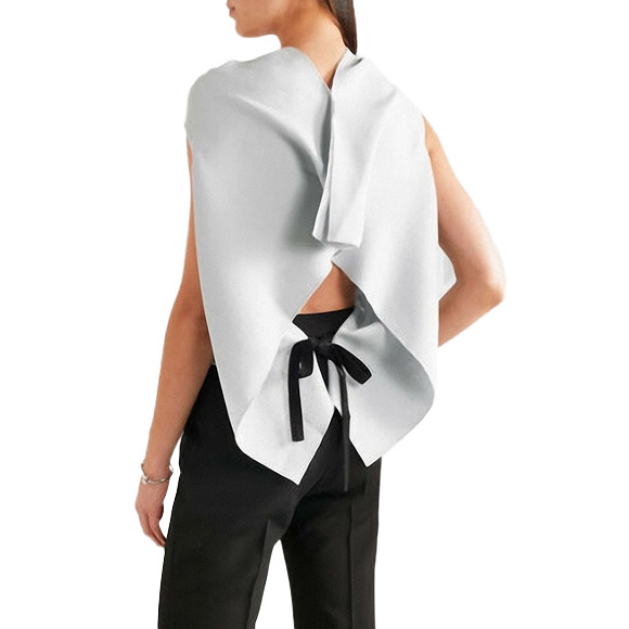 Experience Roland Mouret's iconic Eugene Open Back Top in cream crepe. With elegant draping, a surprising open-back design, and a playful contrast tie. The asymmetric neckline adds a unique touch to this sleeveless piece that's ready for any occasion.