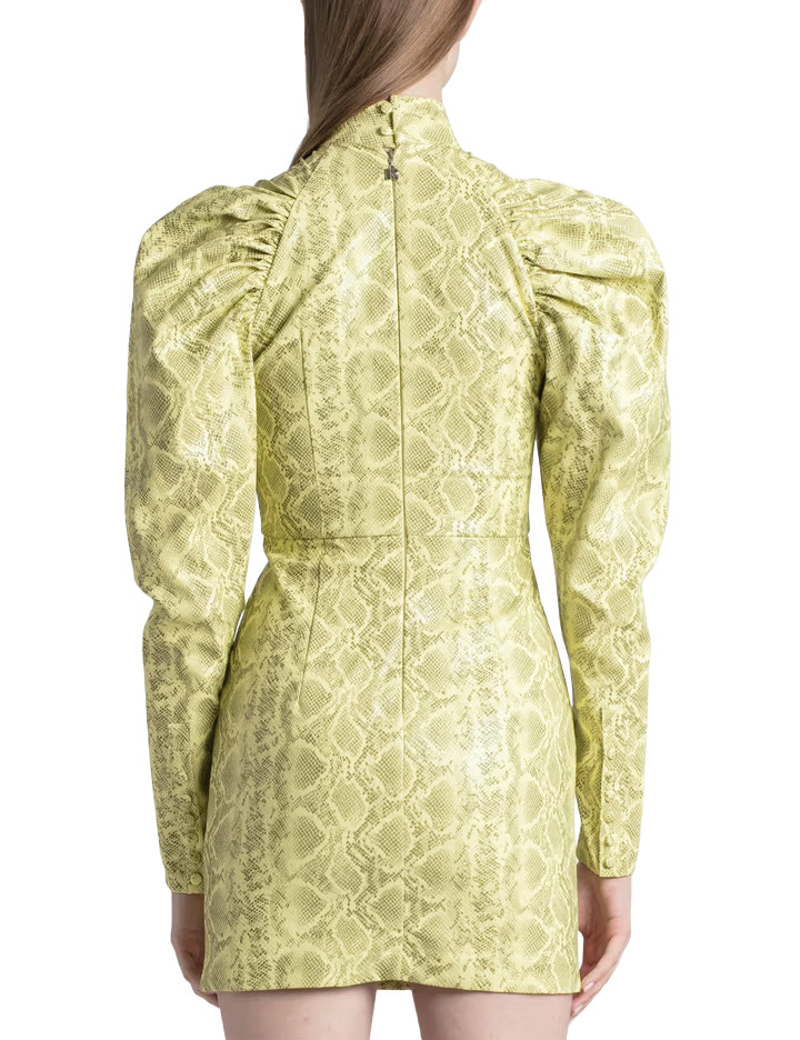 The Kim Dress by Rotate Birger Christensen is a striking mini dress crafted from faux leather with a chic snake print design. Featuring a sophisticated turtleneck and statement puffy sleeves, this dress is accented with button details for added flair. It includes a concealed zipper closure at the back, all in a vibrant Yellow Pear Comb color that makes a bold statement for any occasion.