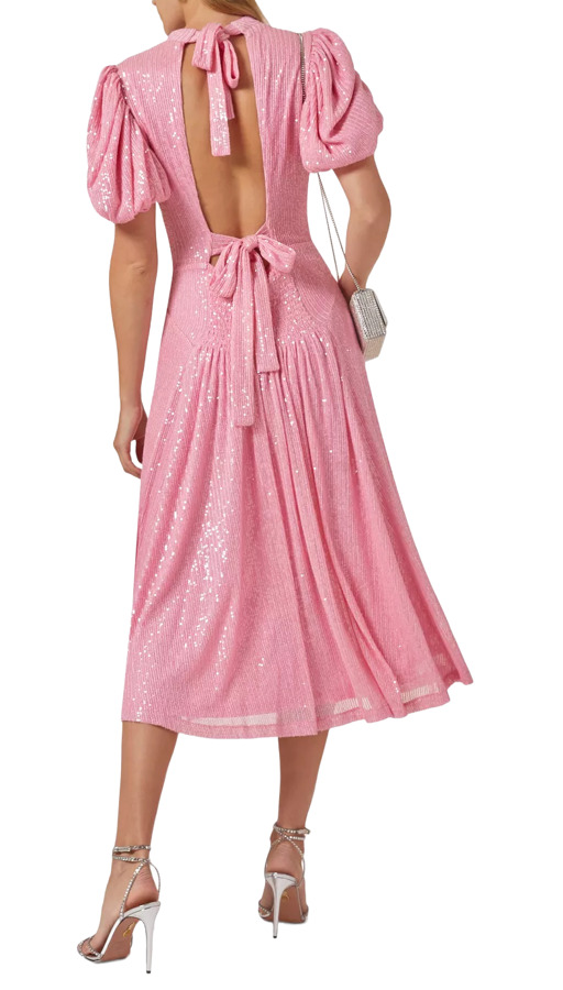 Rotate Birger Christensen has created a captivating midi dress that marries an ultra-feminine silhouette with striking embellishments. Designed with a sophisticated high neckline and short, puffy sleeves, the elegant silhouette is complemented by an alluring open back feature. Adding to the dress's allure are rows of sequins that layer across the bodice, catching the light with every movement to deliver a breathtaking, shimmery finish.