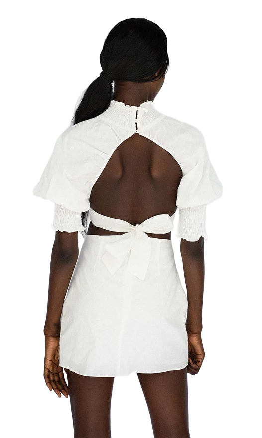 The Peta Dress is designed to flatter, crafted from a high-quality natural linen blend in a chic off-white hue. It showcases shirred detailing at the neckline, cuffs, and waist, along with a stylish cutout at the waist and a tie closure at the back. The fitted skirt adds a touch of elegance, making this dress perfect for any occasion!
