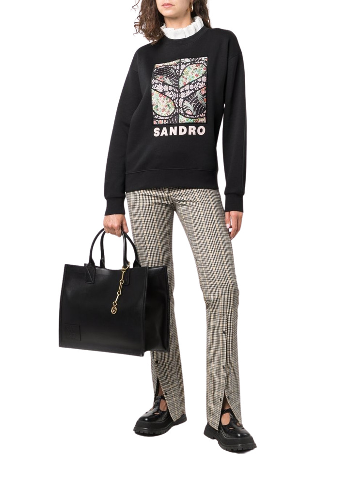 Flowers and frills and prints, oh my! This Sandro Paris sweatshirt has got it all. With a charming floral panel and ruffled neckline, it's anything but basic. Made from an organic cotton blend, it features a logo print to the front, drop shoulders, and a straight hem. Perfect for adding a touch of whimsy to any casual outfit.