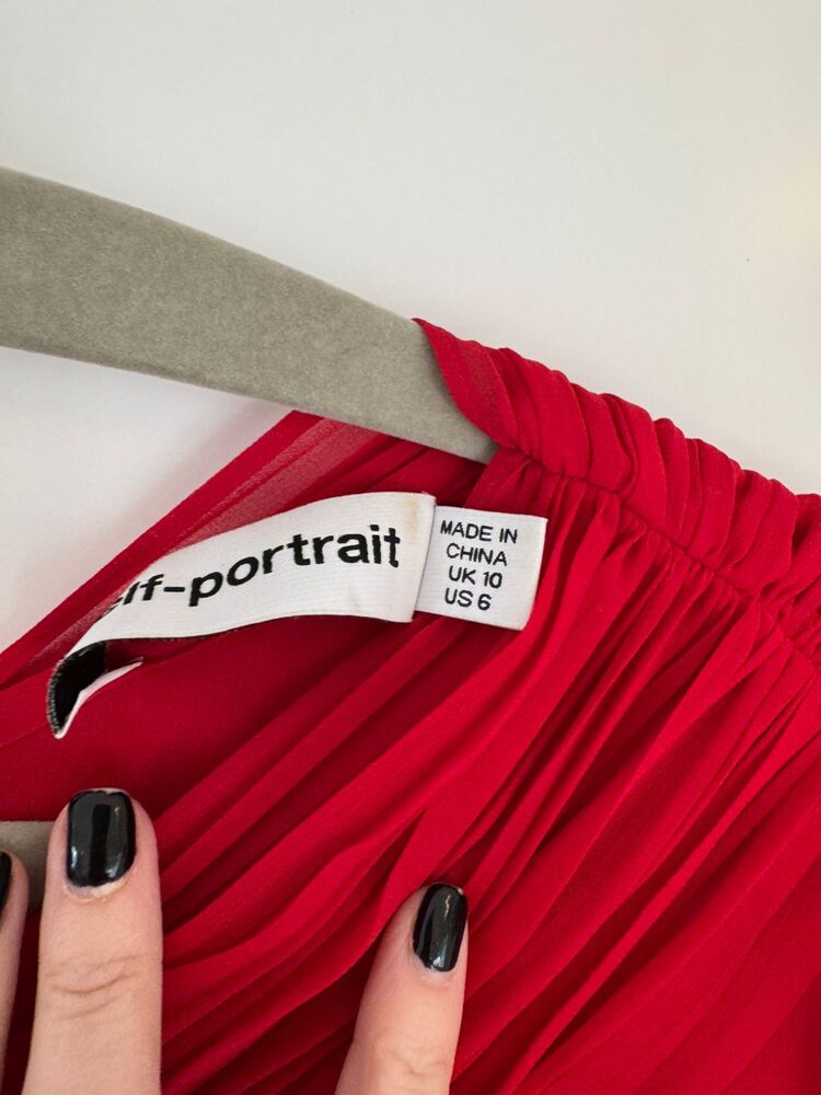 Self Portrait's feminine aesthetic shines in this elegant midi dress, featuring a softly draped bodice with ruched cross-over panels and a pleated skirt. Sheer lace trims adorn the hem, adding a delicate touch. Complete the look with drop earrings and strappy sandals for a refined evening ensemble.
