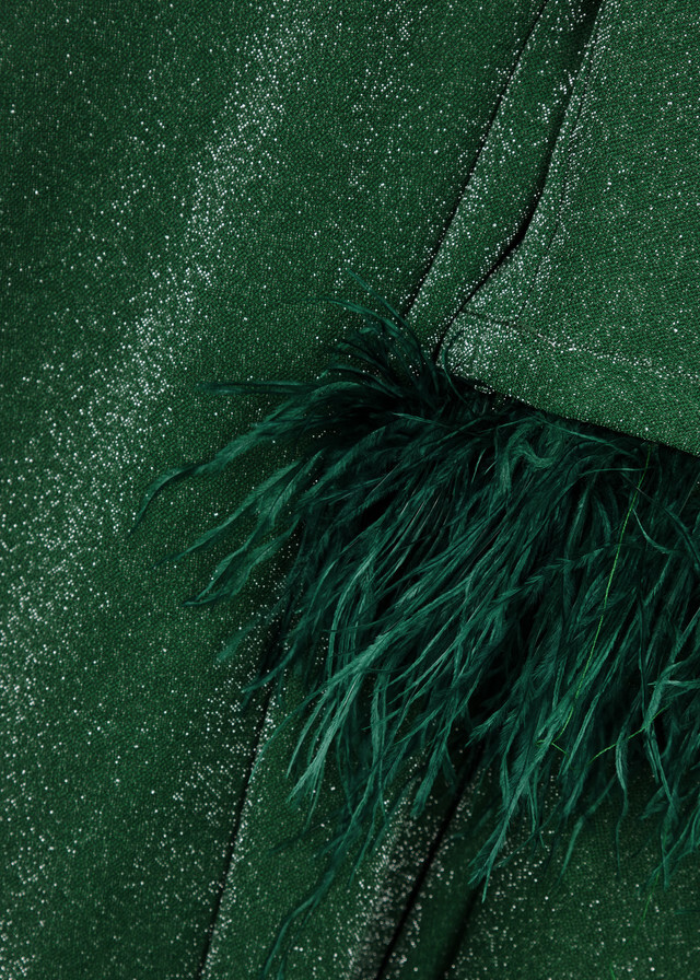 Sleeper's Cosmos pajama set transitions effortlessly from bedroom to bar. Crafted from a comfortable jersey woven with metallic threads for a touch of after-dark sparkle, the set features a loose shirt and cropped trousers adorned with wispy ostrich feathers for added glamour.