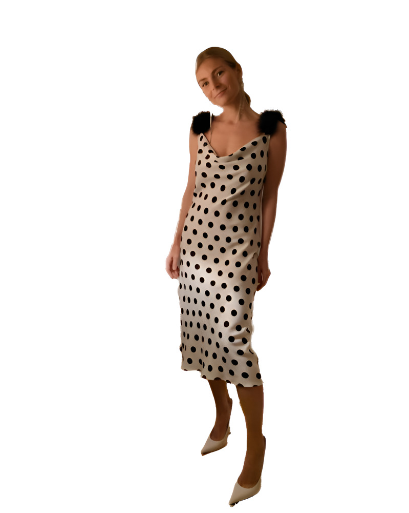 Get ready to dance the night away in the Sleeper Voulez Vous Dancer Polka Dot Dress! With its playful polka dot pattern and marabou feather straps, this dress is a true showstopper. The feather straps add a touch of vintage glamour, while the comfortable and flowy slip silhouette allows for effortless movement on the dance floor. Get ready to fabulous!