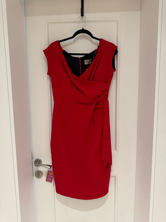 The Hourglass Faux Wrap Pencil Dress by The Pretty Dress Company features a signature design with a faux wrap-over detail and a side tie. Made from stretch luxe crepe, this tailored pencil skirt hits 27.5 inches (70 cm) from waist to hem. Fully lined with stretch control lining, it ensures a smooth silhouette. Additional features include cap sleeves, a concealed center back zip, and a vent split. Perfect for a dinner date with heels and accessories or dressed down for work with a tote and simple jewelry.