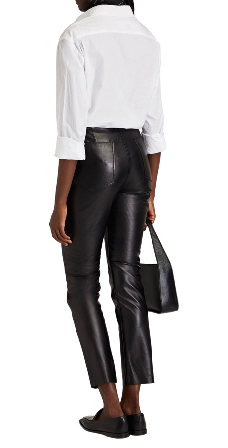These straight-leg pants are expertly crafted from 100% lambskin leather, showcasing a high-rise cut that flatters the silhouette. Featuring two back patch pockets and two front slant pockets, they combine functionality with style. The pants have an unfinished hem for a modern touch and are fully lined for comfort. They fasten at the front with a concealed hook, button, and zip, ensuring a sleek finish. Made from supple, non-stretchy leather in a mid-weight fabric, these pants require specialist cleaning and are imported for quality assurance.