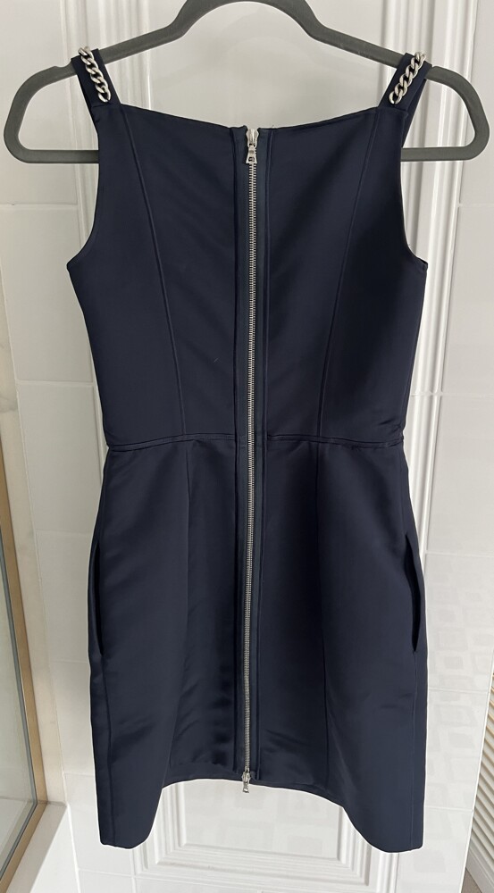 This satin sheath mini-dress by Victoria Beckham boasts chain detail, corset boning, a sleeveless design, and a zip at the back, complemented by on-seam side pockets, all in an unlined silhouette for a chic and practical ensemble.